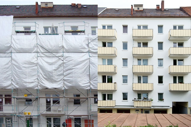 Hoffassade während und nach Renovierung